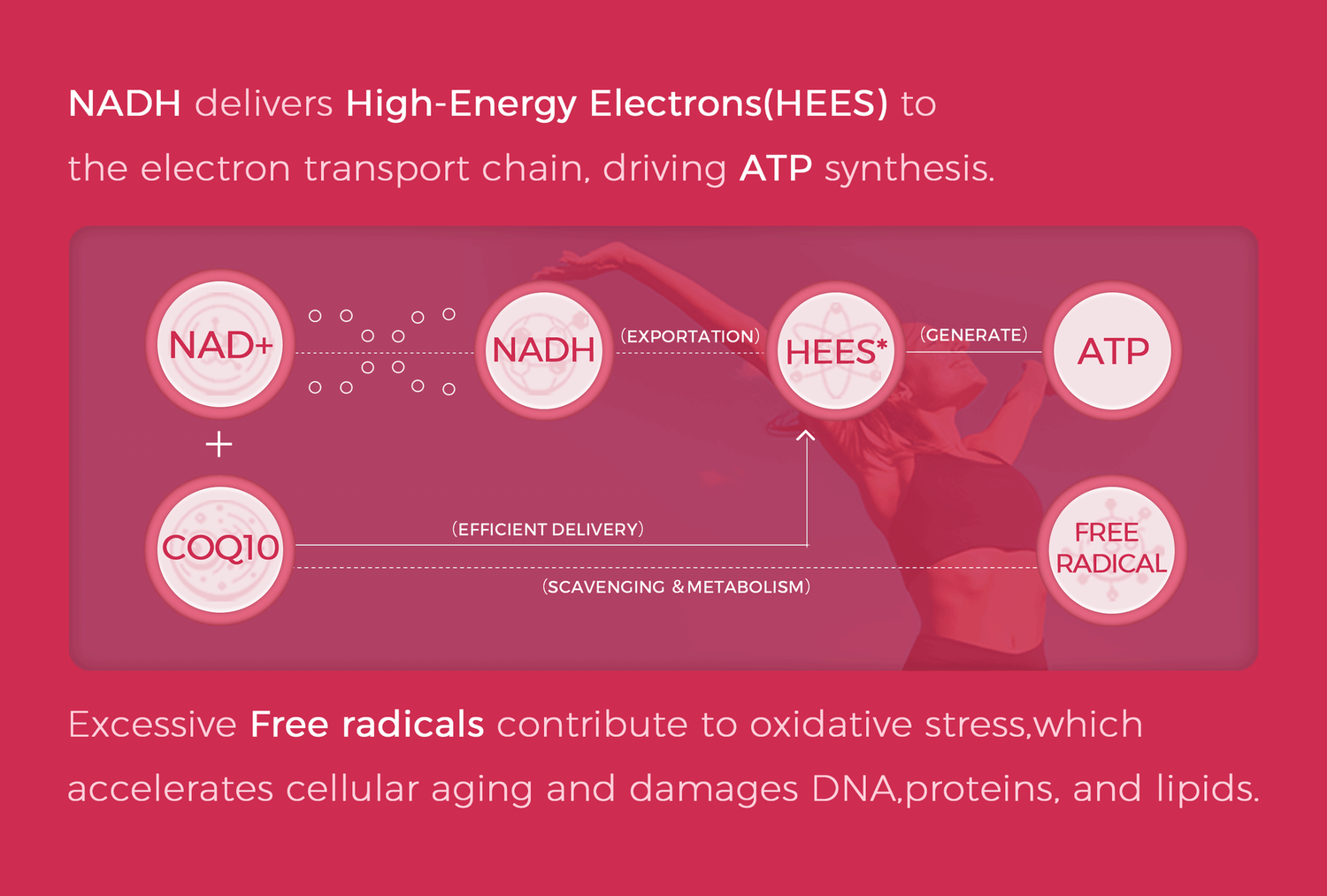 Together, NAD⁺ and CoQ10 optimize mitochondrial function, energize cells, and protect against cellular damage.